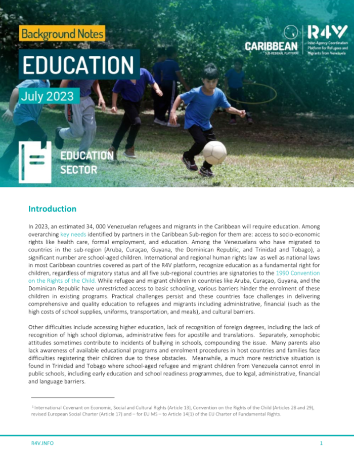 Attachments Introduction In 2023, an estimated 34, 000 Venezuelan refugees and migrants in the Caribbean will require education. Among overarching key needs identified by partners in the Caribbean Sub-region for them are: access to socio-economic rights like health care, formal…
